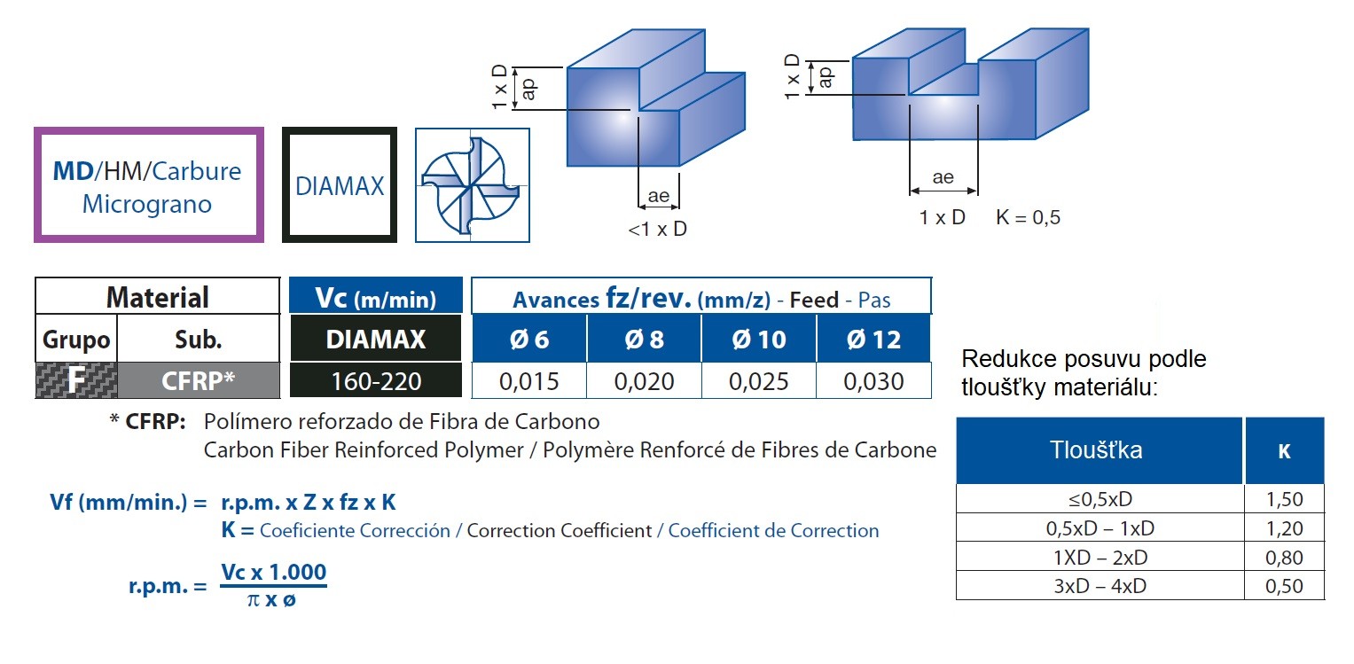 Unikátní geometrie poskytuje nejlepší povrchovou úpravu. Je zapotřebí menší řezná síla, což má za následek velmi dlouhou životnost nástroje. Navrženo pro širokou škálu kompozitů, včetně skleněných vláken a fenolických panelů. Vyhýbá se typickým problémům při práci s kompozitními materiály, jako např. otřepy, delaminace. Speciální silikonová diamantová vrstva DIAMAX pro extrémně dlouhou životnost nástroje. 9283-12